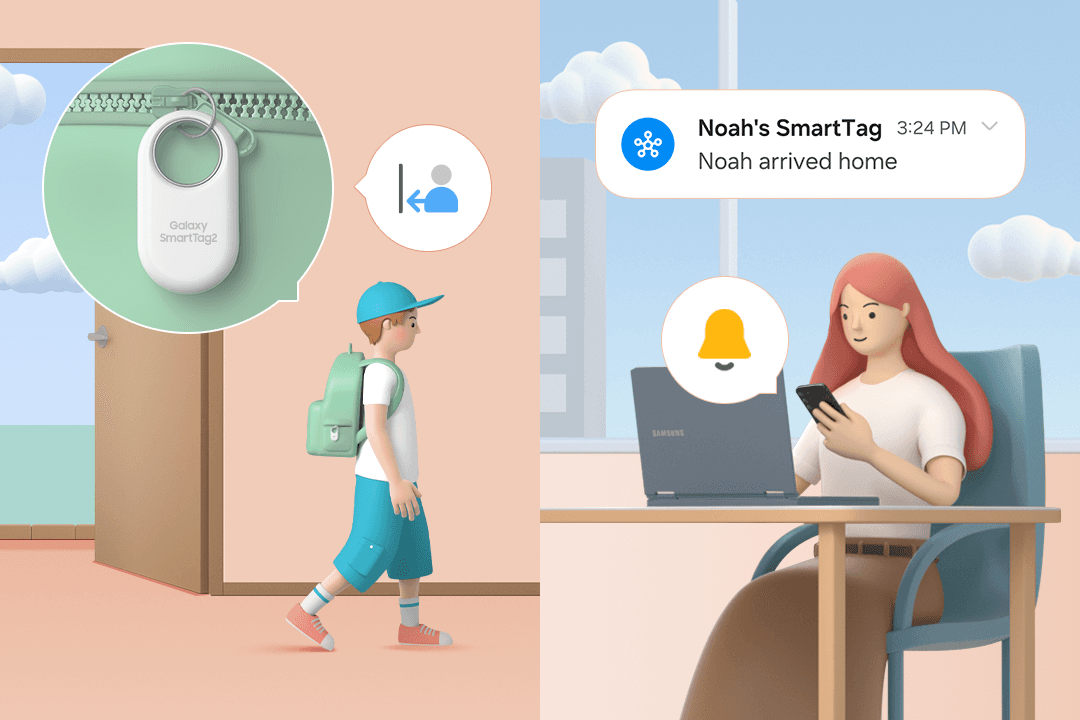 Vous vous demandez souvent si votre enfant est bien rentré à la maison ? Même si votre enfant n’est pas en mesure d’utiliser un téléphone portable ou qu’il l’a éteint, vous n’avez pas à vous inquiéter. SmartTag et SmartThings Station vous avertissent automatiquement de son arrivée à la maison.