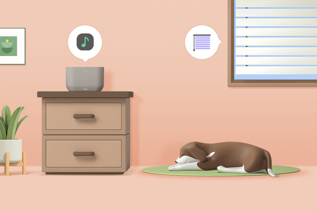 분리불안을 갖고 있는 반려동물에겐 불안감을 느끼지 않도록 환경을 조성하는 것이 중요합니다. 외출 시, 자동으로 블라인드가 내려가고 음악이 재생되도록 루틴을 설정해 보세요. 외부 빛과 소리가 차단돼 반려동물의 불안감을 최소화할 수 있답니다.