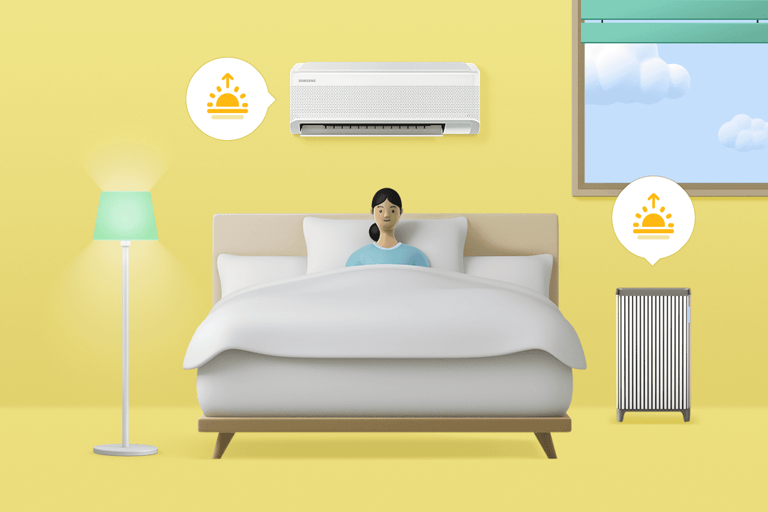 숙면의 마지막 비결은 상쾌한 기상입니다. 자연스럽게 잠에서 깰 때, 비로소 완벽한 잠을 잤다고 할 수 있죠. 알람이 울리기 전에 블라인드가 열리고, 공기청정기와 에어컨이 스마트 모드로 작동되게 설정해 보세요. 스마트싱스가 기분 좋은 기상까지 만들어줍니다.