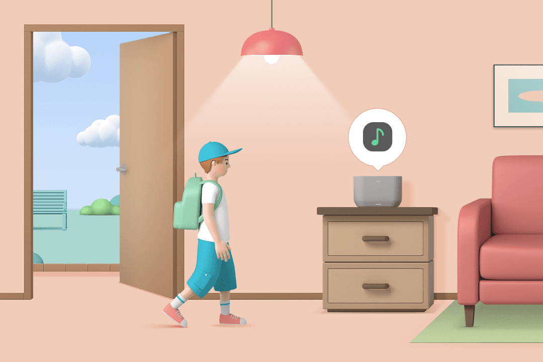 아무도 없는 집에 아이가 혼자 귀가하는 걸 생각하면 속상한 마음이 들 때가 있죠. 스마트싱스로 우리 아이를 반갑게 맞이해주세요. 아이가 도착하고 현관문이 열리면, 거실 조명이 켜지고 스피커에서는 아이를 반갑게 맞이하는 웰컴 멘트가 나오도록 설정할 수 있어요.