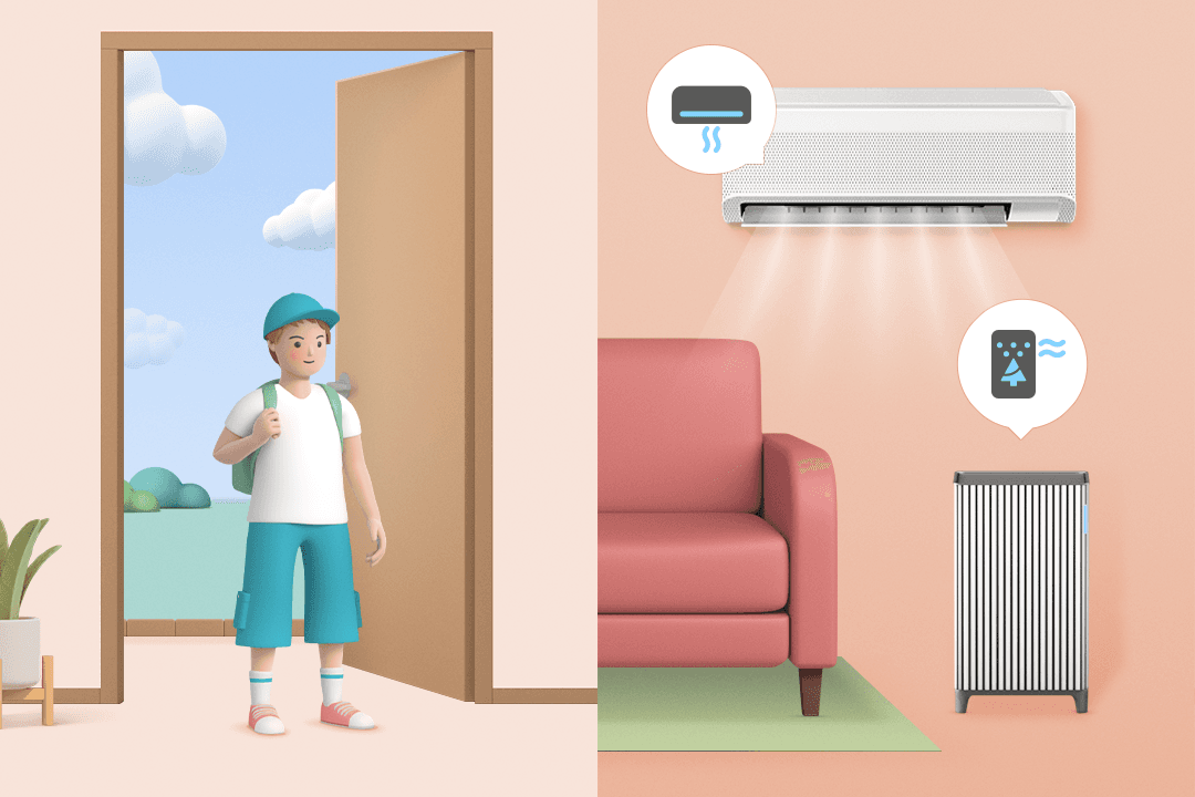 스마트싱스 루틴으로 쾌적한 귀가를 만들어 아이의 건강을 지켜주세요. 아이가 집에 혼자 귀가할 때마다 무더운 날씨에는 시원한 에어컨을, 먼지가 심한 날에는 공기청정기를 자동으로 틀어 쾌적한 환경을 만들어줍니다.