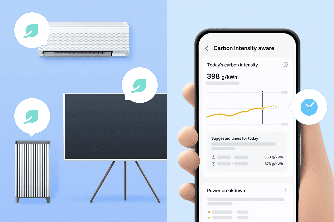 이제 탄소 배출량을 고려하여 [AI 절약 모드]를 실행할 수 있어요. AI 절약 모드에서 [탄소중립 실천] 옵션을 선택하면, 스마트싱스가 탄소 배출량이 높은 시간에 자동으로 AI 절약 모드를 실행해 줍니다. 더욱 똑똑하게 에너지 소비량을 관리하고 탄소 배출량을 줄여 보세요.