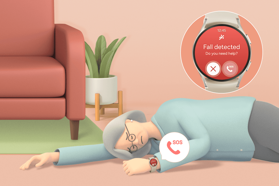 나이가 드신 부모님이 넘어지는 일은 참 위험하죠. 갤럭시 워치는 이러한 사고를 감지하고 위험을 판단해 알아서 긴급 구조 요청을 보내줘요. 동시에 보호자에게는 위치 정보가 담긴 문자 메시지도 함께 전달해 빠른 조치가 가능하도록 도와줘요.