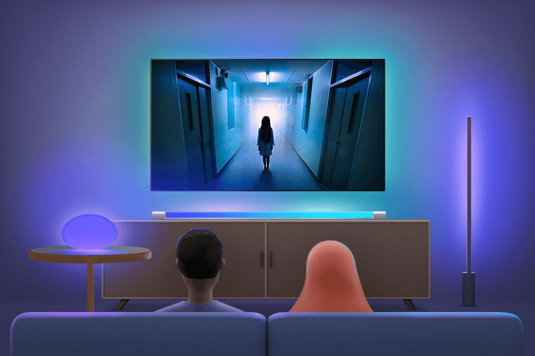 TV에서 넷플릭스나 디즈니+ 영화를 즐기나요? Hue Sync(휴 싱크)를 이용하여 좀 더 생생한 관람 경험을 만들어 보세요. TV 화면의 색감을 주변 공간으로 확장시켜 영화 속 세상에 몰입할 수 있도록 도와줍니다. 이제 공포영화 속 주인공의 오싹함을 직접 체험해 보세요.
