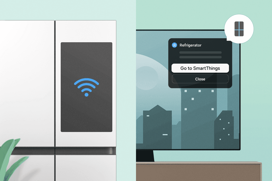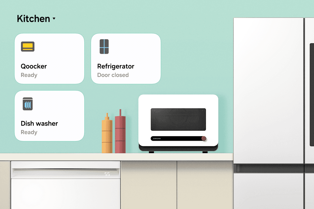 스마트홈을 위해서는 스마트싱스에 기기 연결이 필요해요. 삼성의 신제품에는 모두 저전력 블루투스가 탑재되어 있어요. 덕분에 근처에 연결 가능한 기기를 모바일 팝업으로 알 수 있답니다. 이제 연결할 제품을 고르기만 하면 스마트홈 완성!