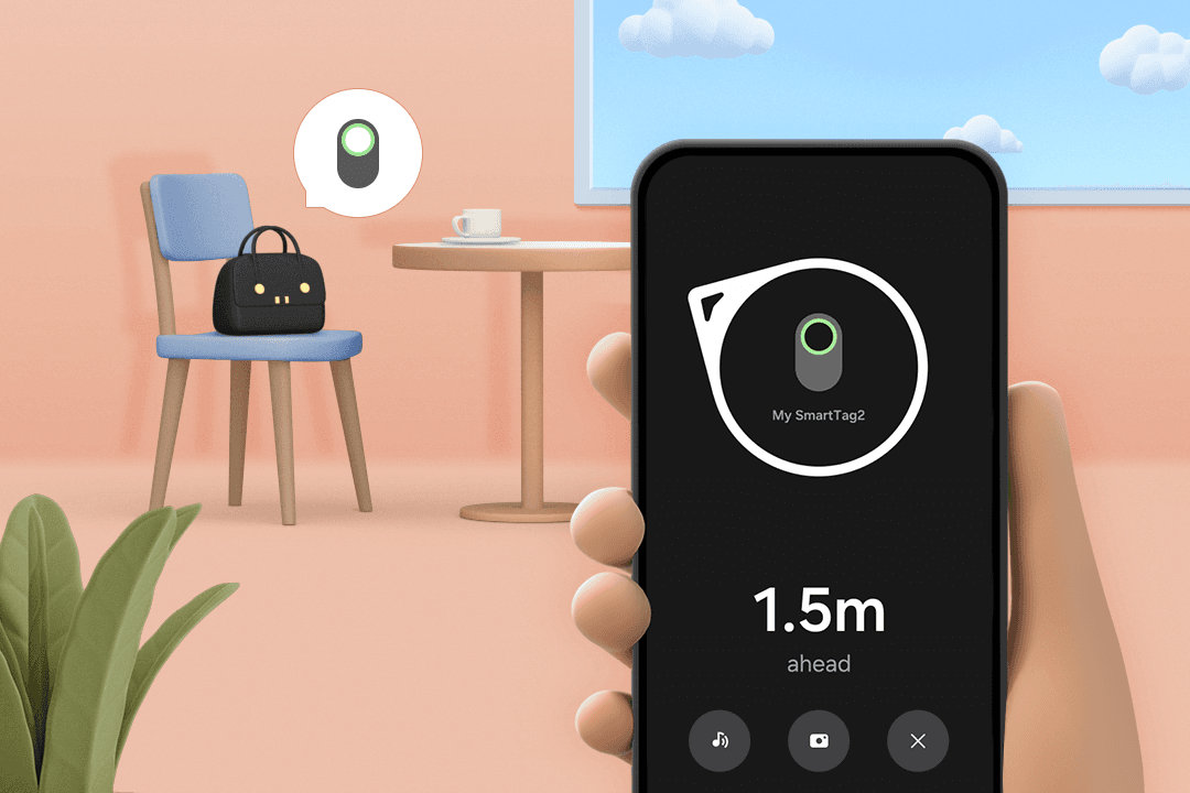 중요한 물건을 분실하셨다고요? 걱정 마세요. 스마트태그2 등록 시 자동 설치되는 스마트싱스 Find(파인드)의 [내 근처 탐색] 기능을 활용해 보세요. 화면에 표시된 위치정보에 따라 걷기만 하면 어느새 짠! 스마트태그2에 가까워지면 자동으로 남은 거리와 방향까지 표시되어 물건 찾기가 훨씬 빠르고 간편해져요.