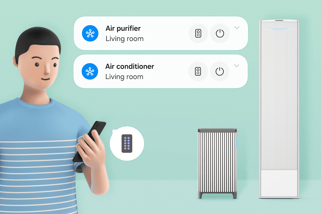 먼지가 너무 많거나 무더위에 지친 날, 집에 도착하면 바로 리모컨부터 찾으시죠? 이젠 손에 들고 있는 갤럭시 핸드폰을 보세요. 공기청정기와 에어컨 리모컨이 잠금화면에 떠 있을 거예요. 바로 눌러 켜기만 하면 돼요.