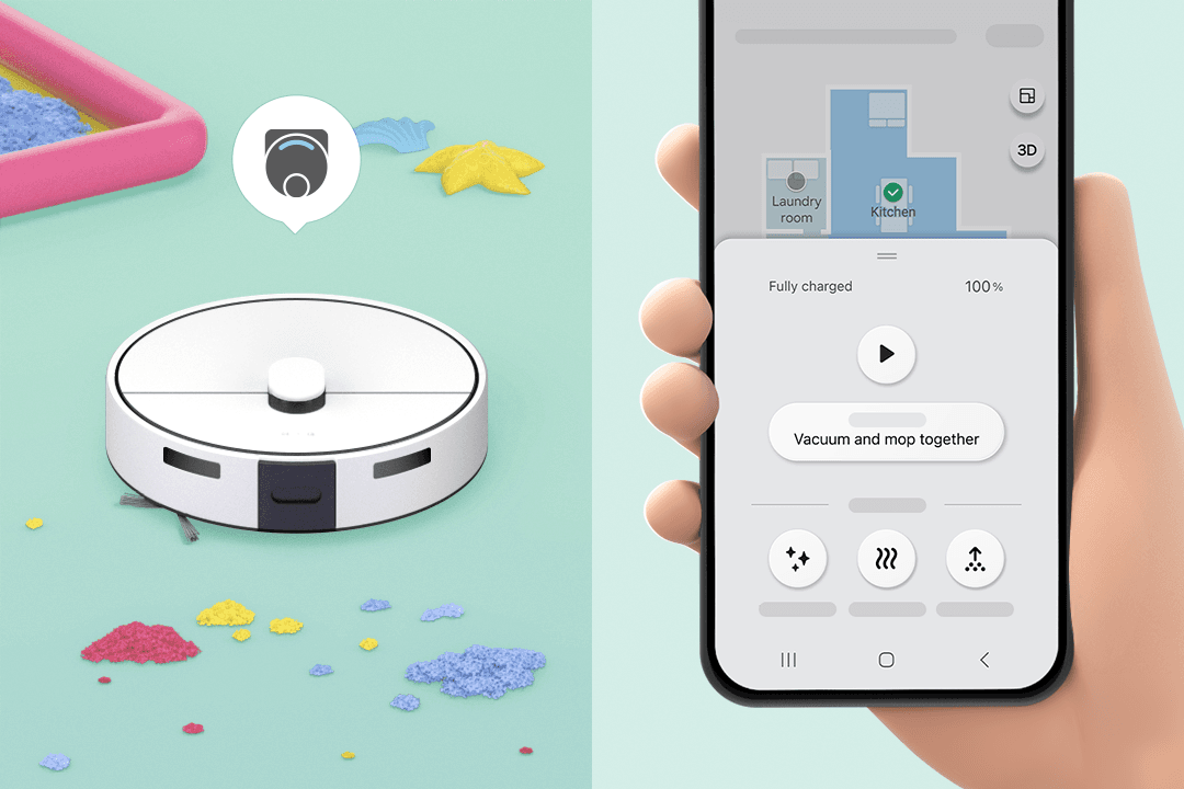 아이나 반려동물이 있는 집은 집안이 쉽게 더러워지곤 하죠. 바닥에 쏟아진 모래나 과자 부스러기를 발견하면 손에 들고 있는 갤럭시 핸드폰을 켜세요. 화면에 나타난 리모컨을 눌러 로봇청소기를 호출하고 가족과의 즐거운 시간을 놓치지 마세요.
