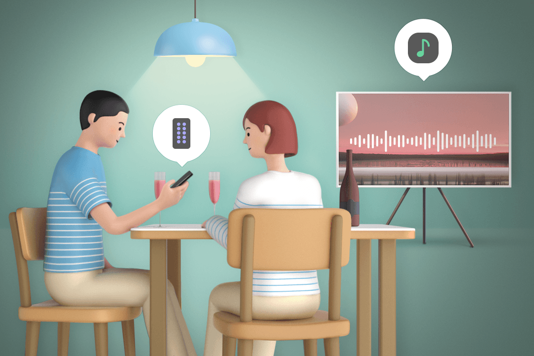 소중한 사람과 함께 하는 저녁 시간, 멋진 영상과 음악으로 분위기를 만들어볼까요? 이젠 리모컨을 찾느라 분위기를 망칠 필요가 없어요. 내 손에 있는 갤럭시 핸드폰이 곧 리모컨이니까요. 이제 편안하게 키고, 오붓한 시간을 보내세요.